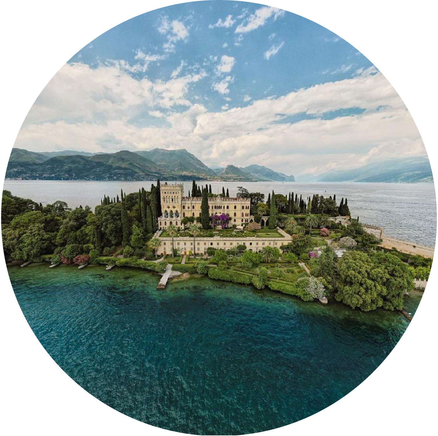 L’Isola del Garda è un’apparizione regale: la villa in stile neogotico veneziano e i suoi giardini sembrano sospesi sull’acqua. Navigarle intorno è come sfogliare una fiaba.
